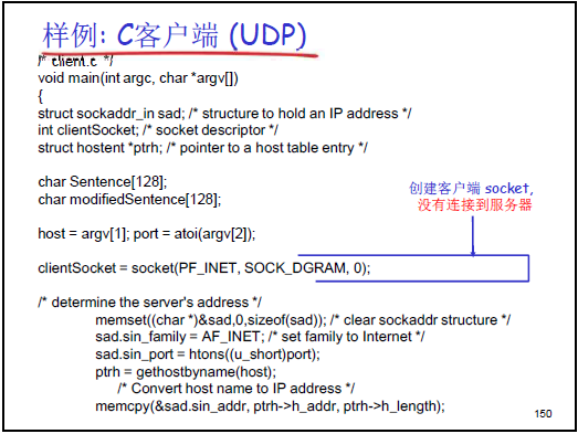 void main(int argc, char *argv[]) {struct sockaddr_in sad; // 存储服务器端节点信息int clientSocket; // 客户端UDP套接字描述符struct hostent *ptrh; // 域名解析结果指针char Sentence[128]; // 存储用户输入的字符串char modifiedSentence[128];// 存储服务器返回的大写字符串int port; // 服务器UDP端口号char *host; // 服务器主机名(从参数获取)// 1. 从命令行参数获取服务器主机名和端口号host = argv[1];port = atoi(argv[2]);// 2. 创建UDP套接字clientSocket = socket(PF_INET, SOCK_DGRAM, 0);if (clientSocket < 0) { /* 错误处理(省略) */ }// 3. 初始化服务器端 sockaddr_in 结构memset((char *)&sad, 0, sizeof(sad)); // 清空结构sad.sin_family = AF_INET; // Internet 协议族sad.sin_port = htons((u_short)port); // 端口号转换为网络字节序// 4. 域名解析:将主机名转换为IP地址ptrh = gethostbyname(host);if (ptrh == NULL) { /* 错误处理(省略) */ }memcpy(&sad.sin_addr, ptrh->h_addr, ptrh->h_length); // 拷贝IP地址// 5. 从标准输入获取用户输入gets(Sentence);// 6. 发送数据到服务器int addr_len = sizeof(struct sockaddr);sendto(clientSocket, Sentence, strlen(Sentence)+1, (struct sockaddr *)&sad, addr_len);// 7. 接收服务器回复recvfrom(clientSocket, modifiedSentence, sizeof(modifiedSentence), 0, (struct sockaddr *)&sad, &addr_len);// 8. 打印结果并关闭套接字printf("FROM SERVER: %s\n", modifiedSentence);close(clientSocket);