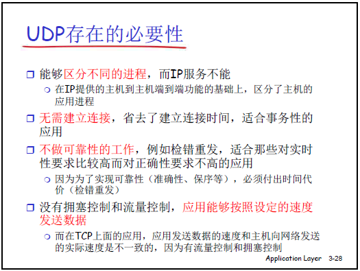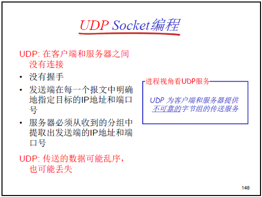 - 不可靠传输:数据可能丢失、乱序(无 TCP 的重传、排序机制),老师举例:“IP 数据报和 UDP 数据报都叫‘数据报(datagram)’,需结合上下文区分,但二者均为无连接、不可靠,UDP 的数据报是应用层与传输层间的 PDU”。