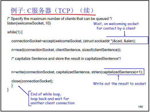 {connectionSocket = accept(welcomeSocket, &cad, &alen); // 接受连接if (fork() == 0) // 子进程(fork返回0){ read(connectionSocket, clientSentence, ...); // 子进程处理通信write(connectionSocket, capitalizedSentence, ...);close(connectionSocket);exit(0); // 子进程通信结束,退出} else // 父进程(fork返回子进程ID){ close(connectionSocket); // 父进程无需该套接字,关闭// 父进程直接回到accept,等待新连接}