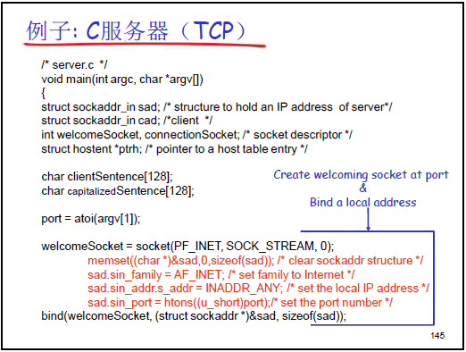 | 2 | 绑定本地端节点:bind(serverSocket, (struct sockaddr *)&sad, sizeof(sad)) |
