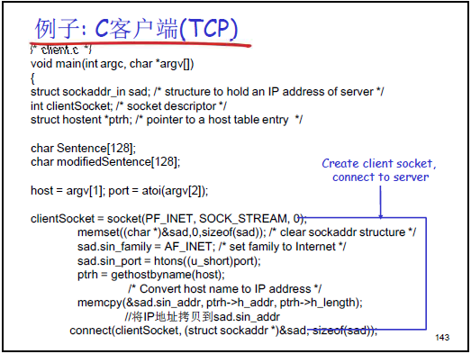 {struct sockaddr_in sad; // 存储服务器的IP和端口int clientSocket; // 客户端套接字(整数标识)struct hostent *ptrh; // 域名解析结果指针char Sentence[128]; // 存储用户输入的小写字符串char modifiedSentence[128];// 存储服务器返回的大写字符串char *host; // 服务器域名int port; // 服务器端口// 1. 解析命令行参数(必须输入“服务器域名”和“端口”)host = argv[1]; // argv[1]:服务器域名(如"www.someschool.edu")port = atoi(argv[2]); // argv[2]:服务器端口(如80),转为整数// 2. 创建TCP客户端套接字clientSocket = socket(PF_INET, SOCK_STREAM, 0); // SOCK_STREAM=TCPif (clientSocket < 0) { perror("socket error"); return; }// 3. 初始化sockaddr_in结构体(服务器地址信息)memset((char *)&sad, 0, sizeof(sad)); // 清空结构体,避免垃圾数据sad.sin_family = AF_INET; // 协议族:TCP/IPsad.sin_port = htons((u_short)port); // 端口转为网络字节序(大端)// 4. 域名解析:将服务器域名转为IP地址ptrh = gethostbyname(host);if (ptrh == NULL) { perror("gethostbyname error"); return; }memcpy(&sad.sin_addr, ptrh->h_addr, ptrh->h_length); // 复制IP到sad// 5. 向服务器发起连接(阻塞至连接建立)if (connect(clientSocket, (struct sockaddr *)&sad, sizeof(sad)) < 0) {perror("connect error"); return;}// 6. 读取用户输入(标准输入:键盘)printf("Enter a lowercase sentence: ");gets(Sentence); // 读取用户输入的小写字符串// 7. 发送字符串到服务器write(clientSocket, Sentence, strlen(Sentence) + 1); // +1:包含字符串结束符'\0'// 8. 读取服务器返回的大写字符串read(clientSocket, modifiedSentence, sizeof(modifiedSentence));// 9. 打印结果并关闭套接字printf("FROM SERVER: %s\n", modifiedSentence);close(clientSocket);