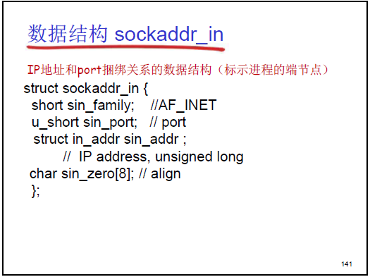 (1)sockaddr_in 结构(对应课件 141 页,用于存储端节点信息