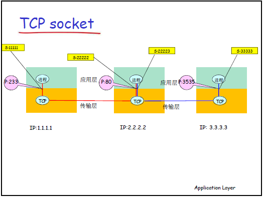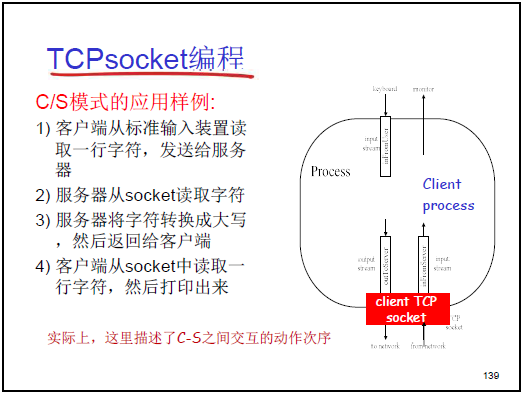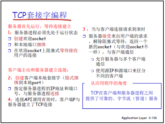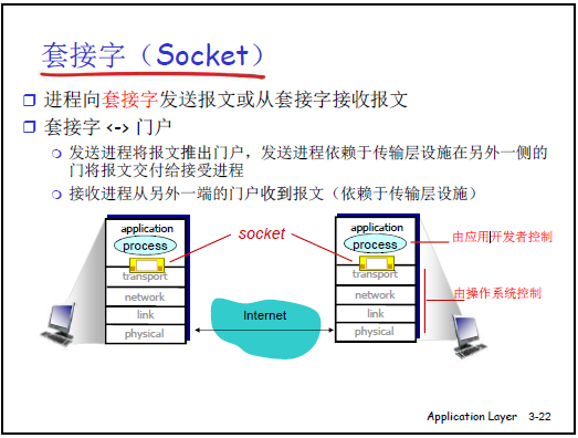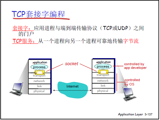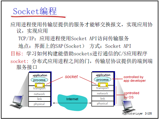 - 应用层通过 socket API 调用传输层服务,对应本章的 TCP、UDP 套接字编程内容
