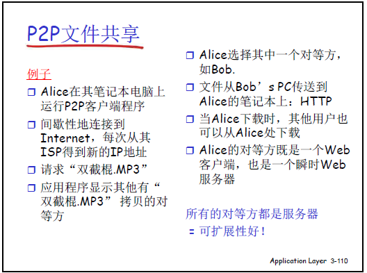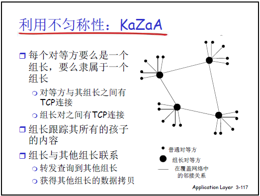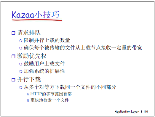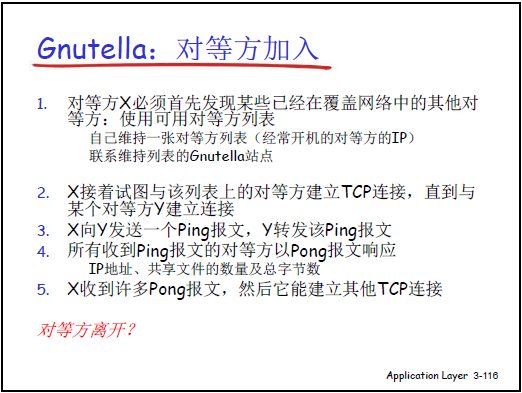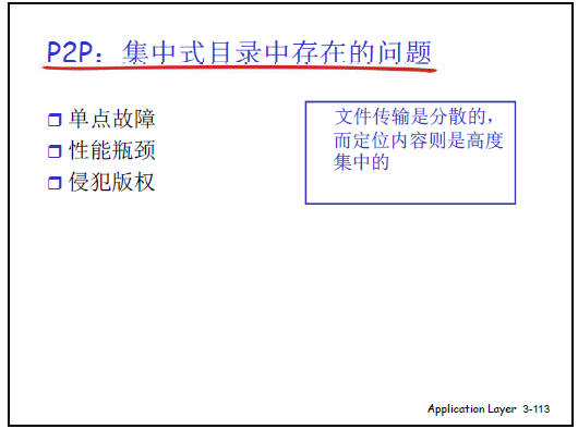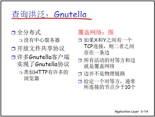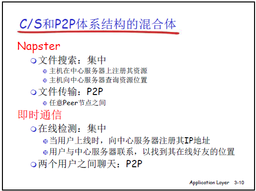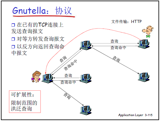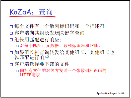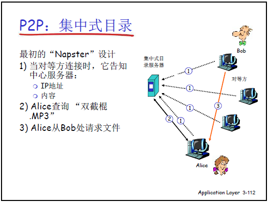- 目录查询(C/S 模式):节点上线时向中心服务器注册(报告 IP 和共享的 MP3 列表);客户端下载前向中心服务器查询 “谁拥有目标音乐”,服务器返回拥有者 IP。