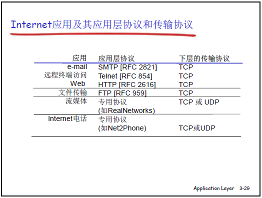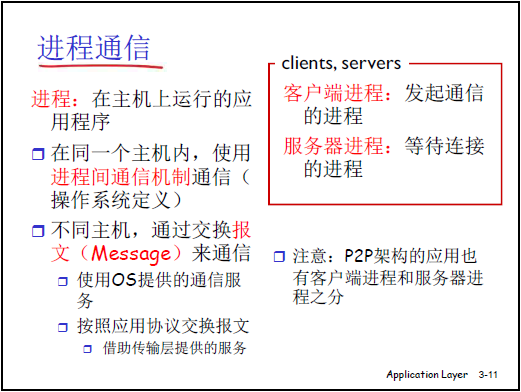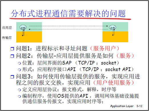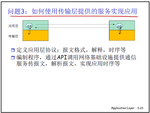- 通过网络基础设施提供的服务,实现应用进程间的通信(例如 Web 的服务器软件与浏览器软件通信)