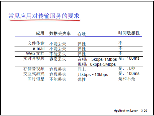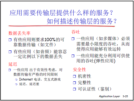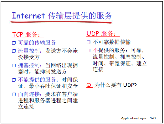 - 传输层向应用层提供的服务,通过 “服务模型(service model)” 描述其指标体系。