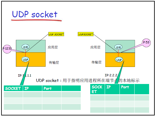 | SOCKET(套接字描述符) | IP(本地 IP 地址) | Port(本地 UDP 端口号) |