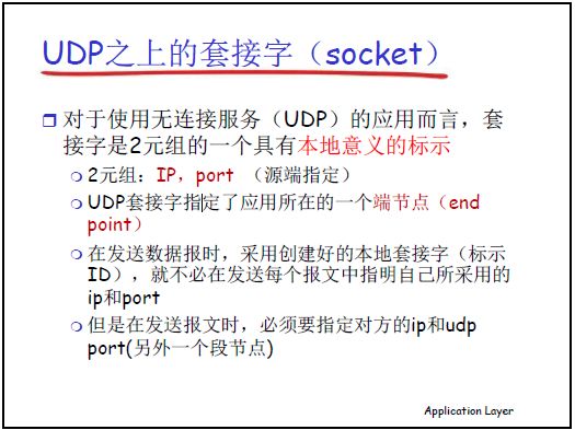 - 绑定范围不同:UDP 套接字仅与本地端节点(2 元组:本地 IP + 本地 UDP 端口) 绑定,不与对方的 IP / 端口绑定(TCP 套接字是 4 元组:源 IP + 源端口 + 目标 IP + 目标端口)。老师强调:“UDP socket 只是本地 IP 和端口的代表,发送时必须额外指明对方的 IP 和 UDP 端口,否则不知道发给谁”。