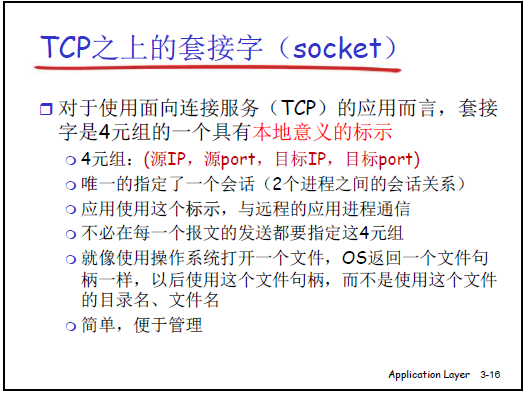 - 特性:建立连接后,应用进程通过 Socket 读写数据,操作系统自动映射到对应的四元组,无需每次指定地址(如打开文件后用句柄操作,而非每次指定文件路径)。