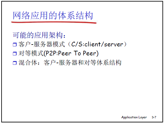 - 应用的交互模式:客户 - 服务器(CS)模式、对等(P2P)模式。