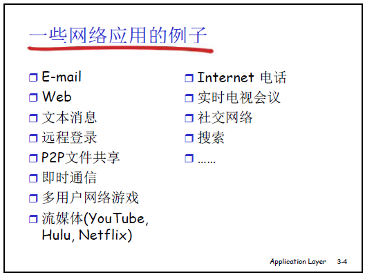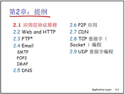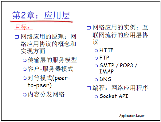 本节课是 “自顶向下” 学习计算机网络的开篇,聚焦网络的最高层(应用层),本章包含原理、实例、编程三个核心部分,是应用层后续内容的总览。