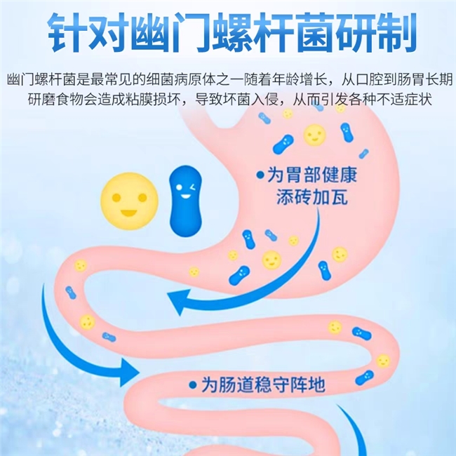 靶向抗幽,多菌协同作战:在菌株体系中,罗伊氏乳杆菌LR08作为靶向抗幽的“主力军”,能精准识别并抢占幽门螺杆菌在胃黏膜的黏附位点,阻断其定植与繁殖,同时分泌抑菌代谢产物。搭配乳双歧杆菌BLa80促进肠道蠕动、增强机体免疫力,植物乳杆菌Lp05辅助改善腹泻,多菌株协同发力,既精准攻克幽门螺杆菌难题,又全面守护肠道菌群平衡,避免了单一菌株调理的片面性。