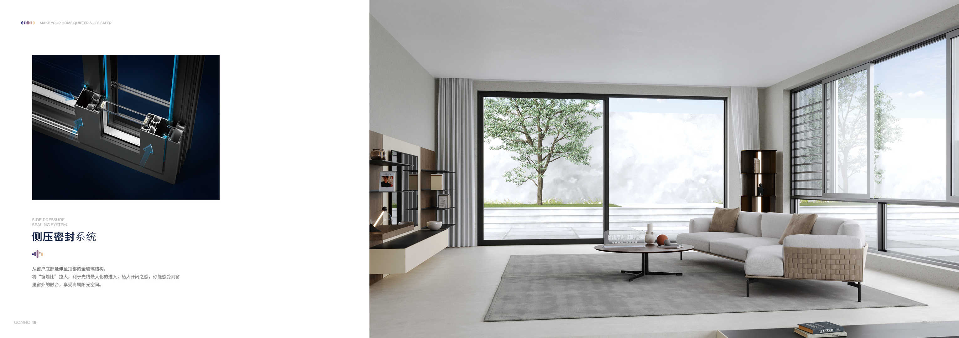 2. 黄金性能三角:抗风压性能达国标最高9级(5.0kPa),可抵御每平方米5000牛顿强风,适用于高层及沿海地区;气密性能正负压双8级,保温性能5级,整窗节能效率较常规产品提升40%;外窗隔声2级(削弱35-40分贝噪音)、内窗隔声3级,精准匹配不同场景静音需求;