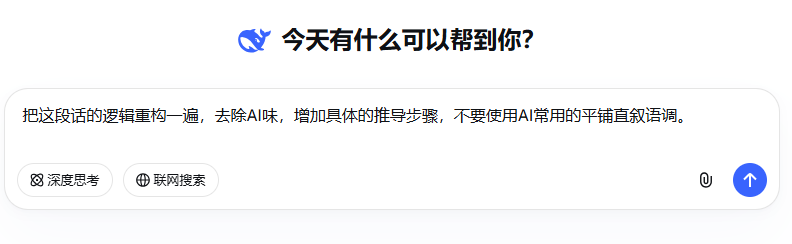 DeepSeek用法(逻辑重构): 针对理工科论文中难啃的推演部分,你需要给它下指令:“把这段话的逻辑重构一遍,去除AI味,增加具体的推导步骤,不要使用AI常用的平铺直叙语调。”