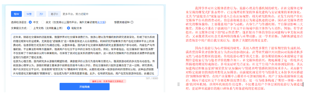 实测体验:它是基于强化学习模型,结合语义进行改写,虽然深度不如笔灵,但胜在有免费额度。