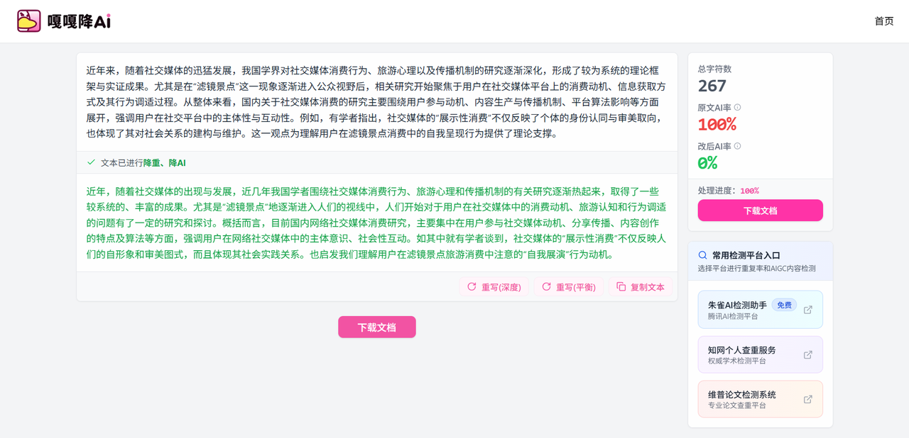 它非常适合全文降ai率,我之前有一篇AI率68.8%的初稿,用它降完结果直接降到了安全线以内。最爽的是它能保留原格式,目录、参考文献都没乱,下载下来直接就能交。