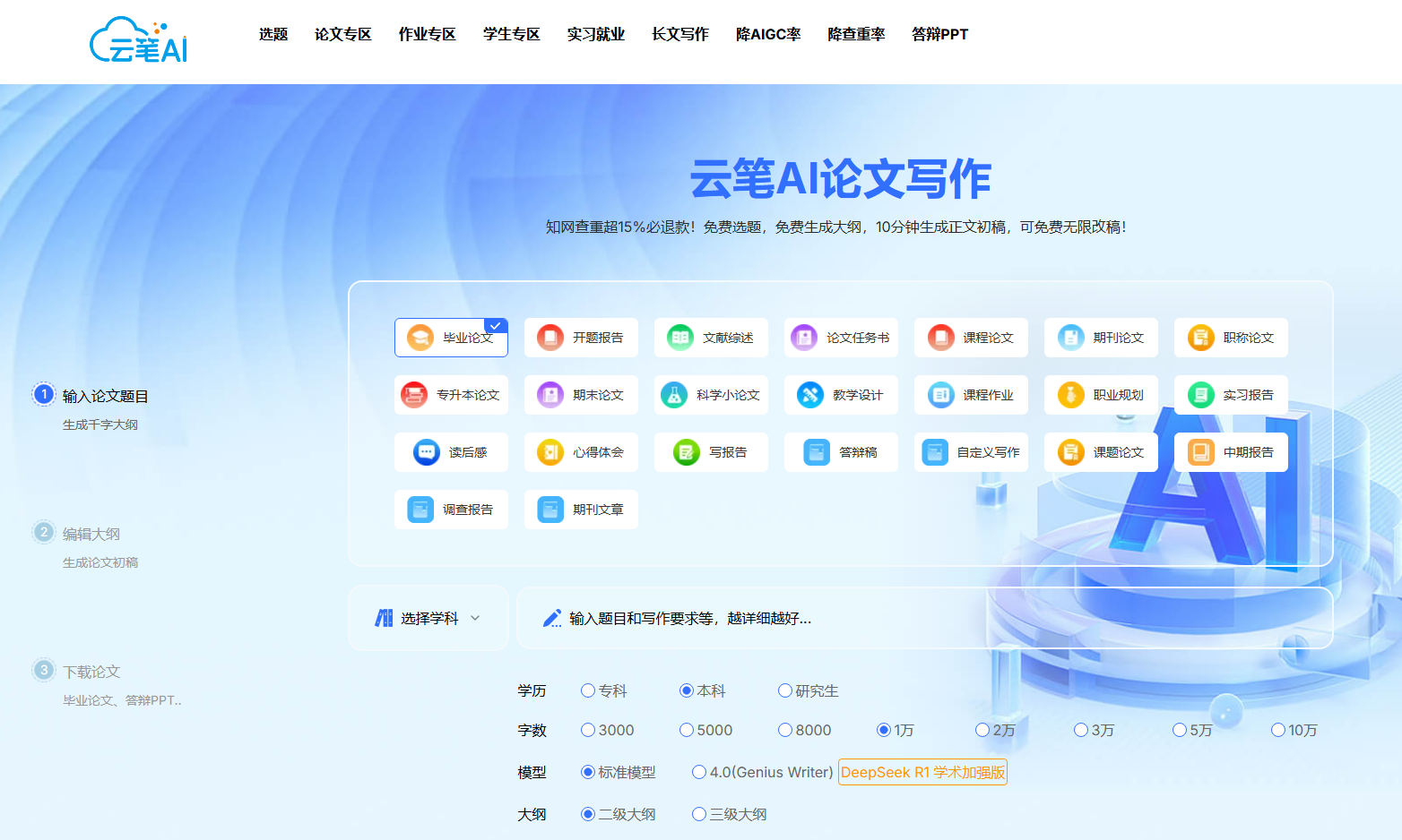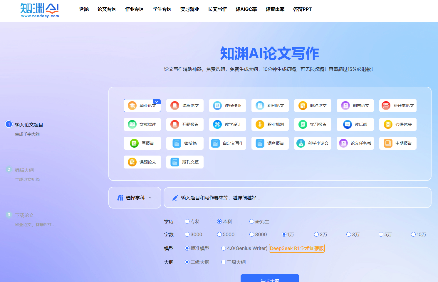 全流程覆盖是它的核心优势,从选题到答辩的所有环节都能提供支持。选题阶段输入专业领域,10秒就能收到10个带选题理由的建议,完全免费;生成的大纲逻辑清晰,还能免费修改编辑;确定大纲后8分钟就能拿到完整初稿,还能同步生成答辩PPT、调查问卷等附加材料,真正实现“一文生成,全套配齐”。