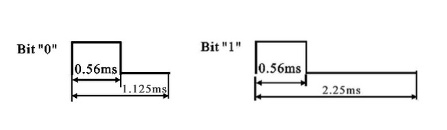 - 逻辑「0」由 0.56ms 的 38kHz 载波和 0.565ms 的无载波间隔组成,周期1.125ms。
