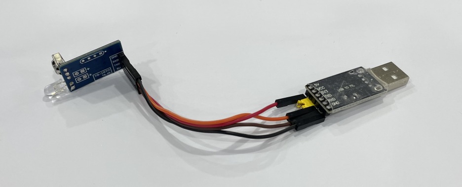 先将红外编解码模块与 USB 转 TTL 模块连接,插到电脑,用串口看看遥控器会发出怎样的编码。