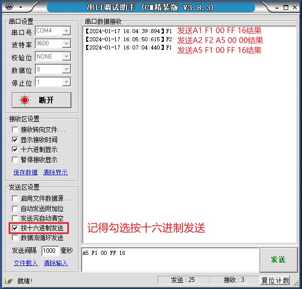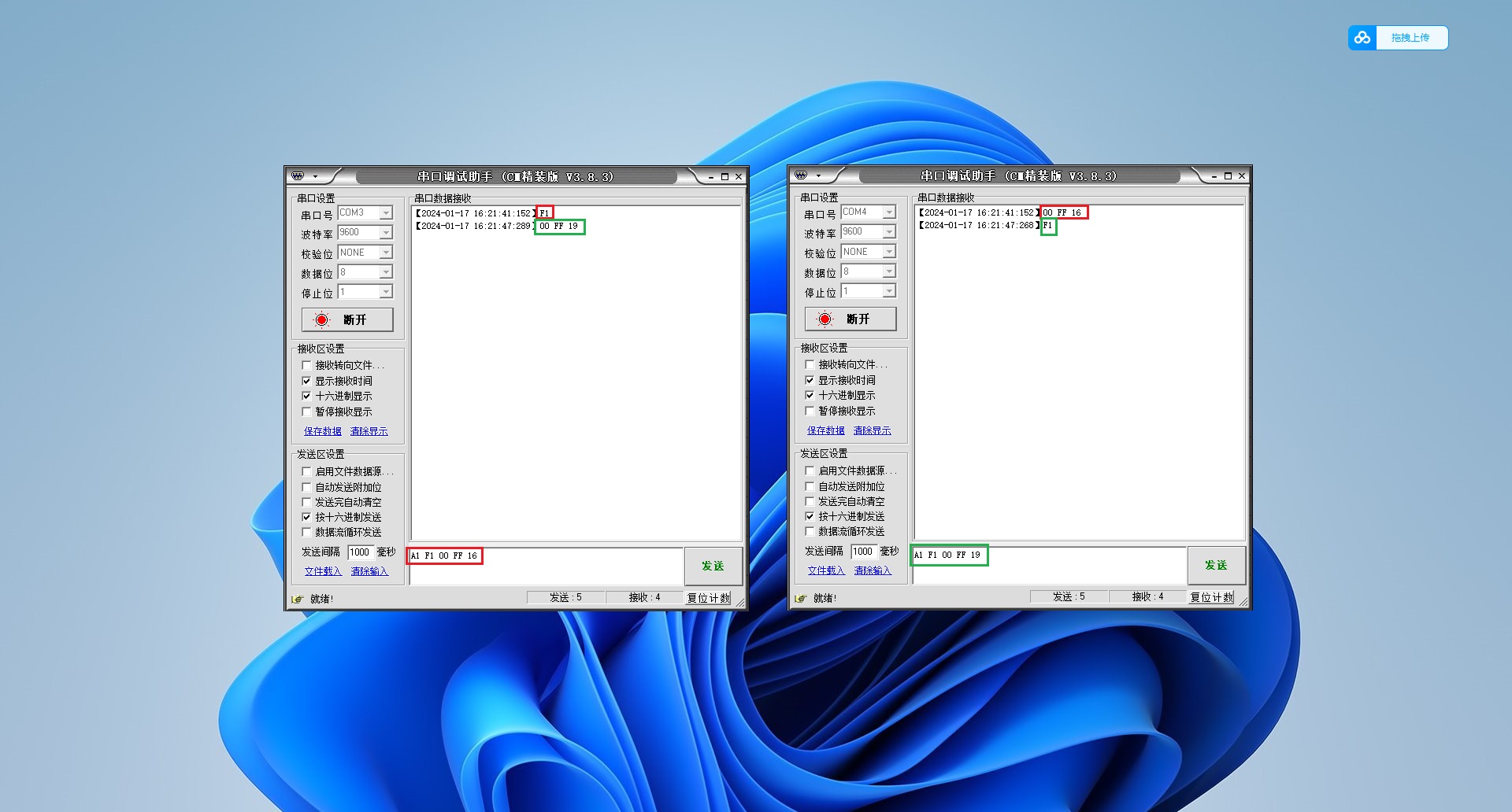 电脑打开两个串口调试助手,发送编码效果如下,红框和绿框各是一次发送结果。