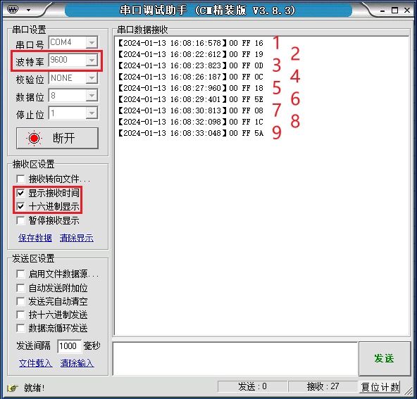 打开串口助手,选择你的串口号,波特率选择 9600;勾选显示接收时间,将换行输出,看的更清楚;勾选十六进制显示。