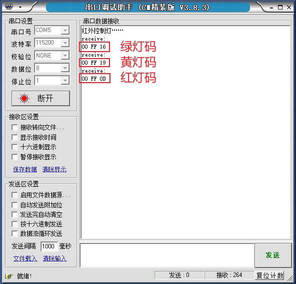 然后就可以按遥控器查看编码啦,以下是我的遥控器 1~9 的编码。我们选择 1 的 00 FF 16 为绿灯码,2 的 00 FF 19 为黄灯码,3 的 00 FF 10D 为红灯码。