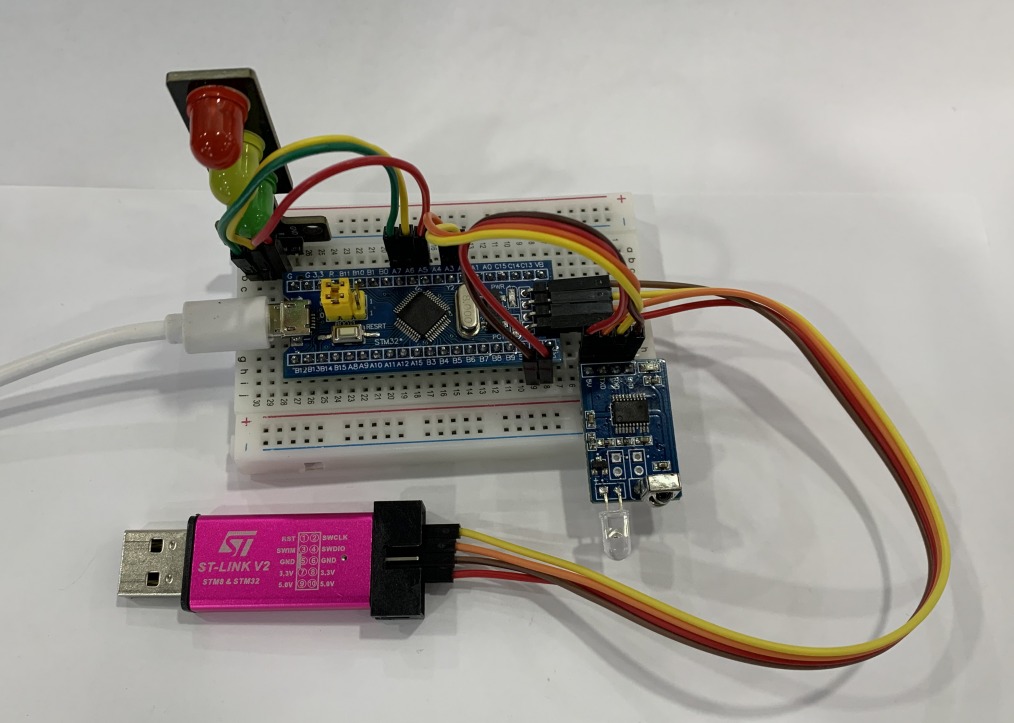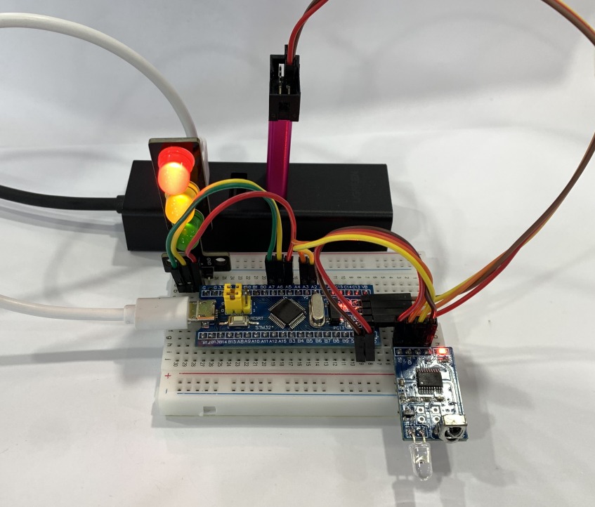 实现目标是我们有一个三色 LED 灯,三个灯各自有特定的信号,遥控器/手机发送红外信号,红外编解码模块收到数据,若含绿灯信号,绿灯亮;再次发送绿灯信号,绿灯灭,黄灯和红灯设定和效果一样。
