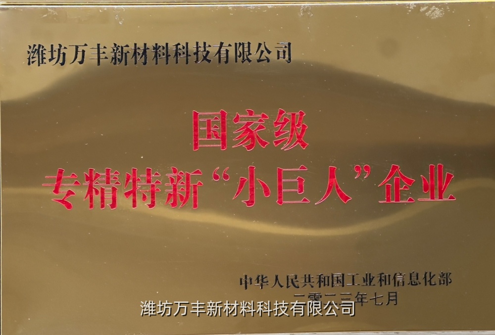 资质与荣誉:潍坊万丰新材料科技有限公司已通过ISO9001、ISO14001、ISO45001国际体系认证,产品通过SGS测试,符合欧盟ROHS和REACH指令;2018年被认定为国家高新技术企业,2023年获评国家级专精特新小巨人企业,还拥有山东省瞪羚企业、潍坊市隐形冠军企业等多项荣誉,是客户眼中技术可靠、交付稳定的优质供应商。