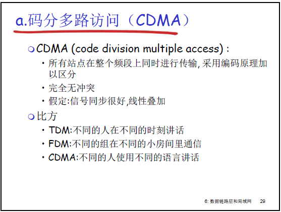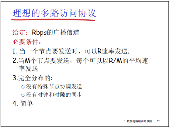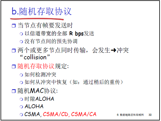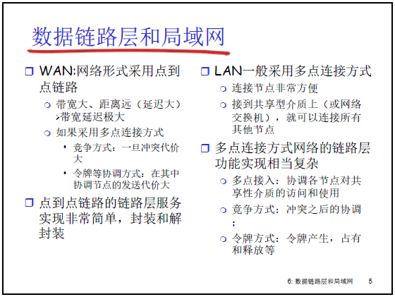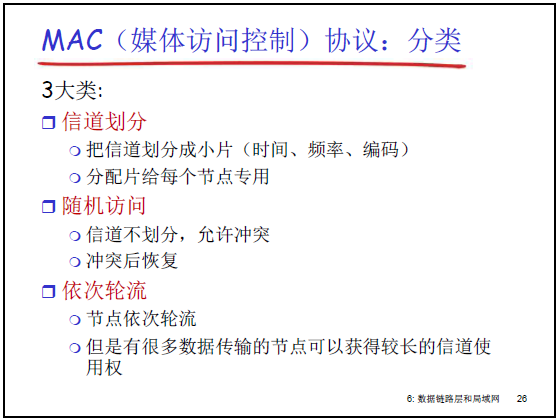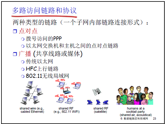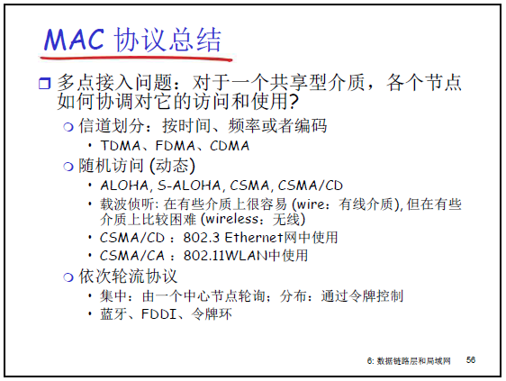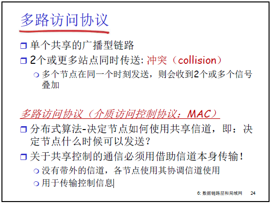 • 多点接入(共享广播信道):解决多节点共享介质的访问协调问题。