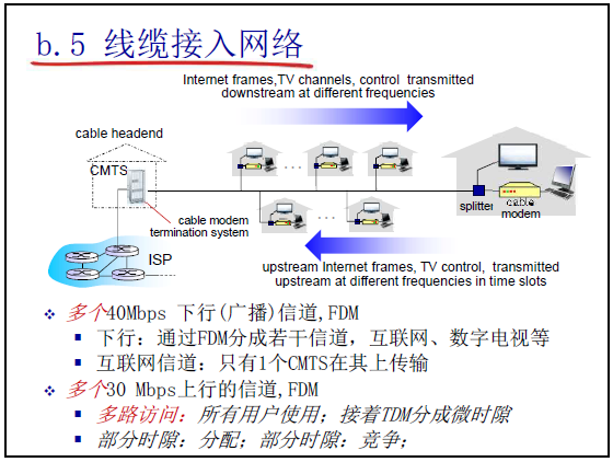 • 采用FDM(频分复用):将带宽划分为多个信道(如互联网数据信道、数字电视信道),仅 CMTS(头端设备)发送数据,广播到所有调制解调器;