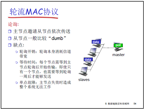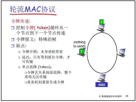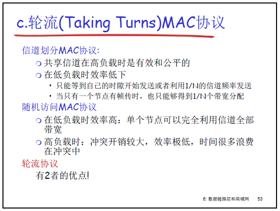 核心思想:结合 “信道划分(高负载好)” 和 “随机访问(低负载好)” 的优点 —— 节点 “依次轮流使用信道”,高负载时无冲突,低负载时无空闲浪费。