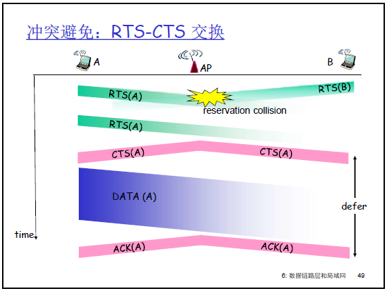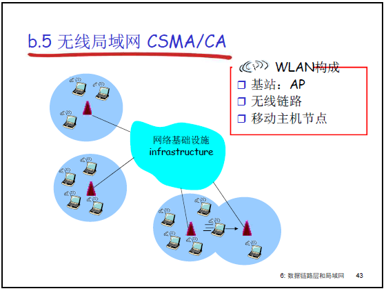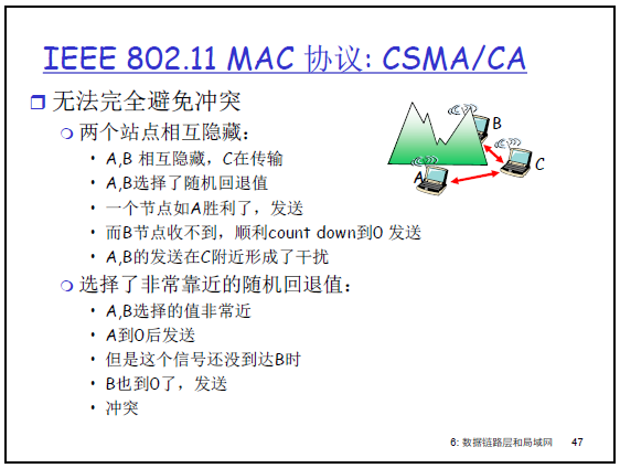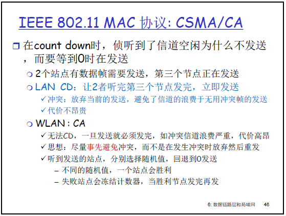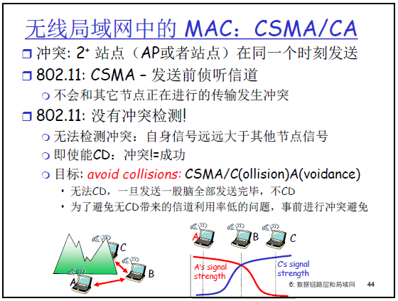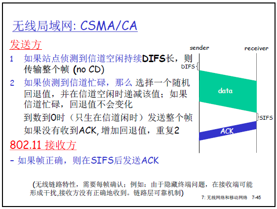 • 无线 LAN(802.11):必选 CSMA/CA(无法检测冲突);