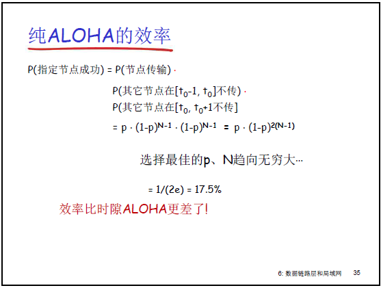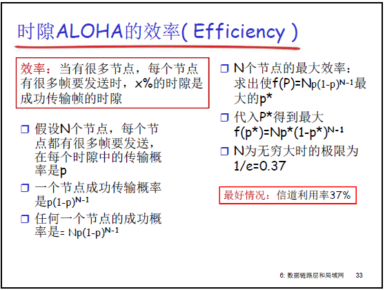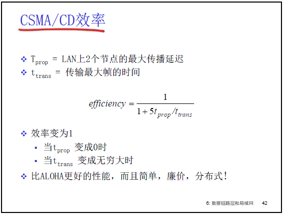 • tprop→0(距离极短)或ttrans→∞(帧极长)时,效率→1(接近 100%),远高于 ALOHA。