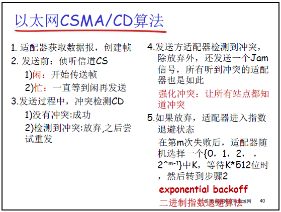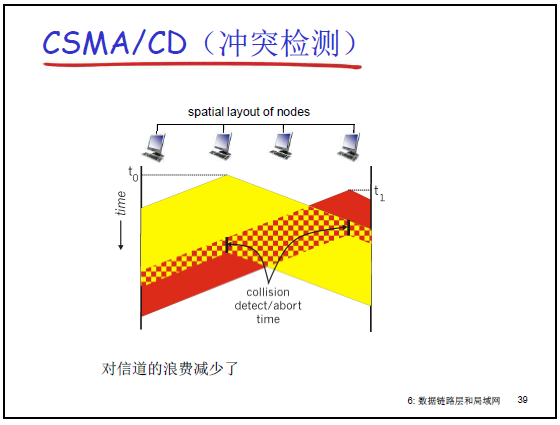 • 优点:冲突后立即停止,信道浪费少,效率高,适用于有线 LAN;