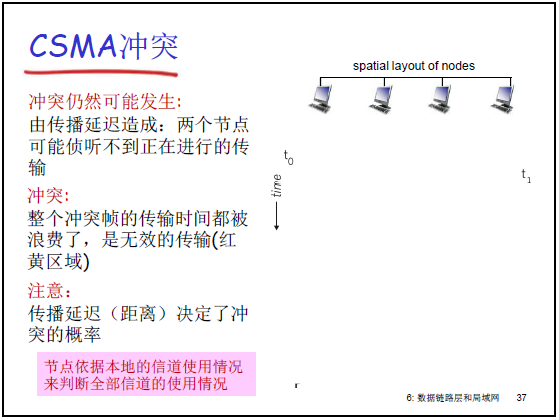 • 例:A、B 为 LAN 中最远节点,A 在 t₀发送,信号需 t_prop 时间到达 B;B 在 t₀<<t<<t₀+t_prop 时侦听(空闲)并发送,导致冲突。
