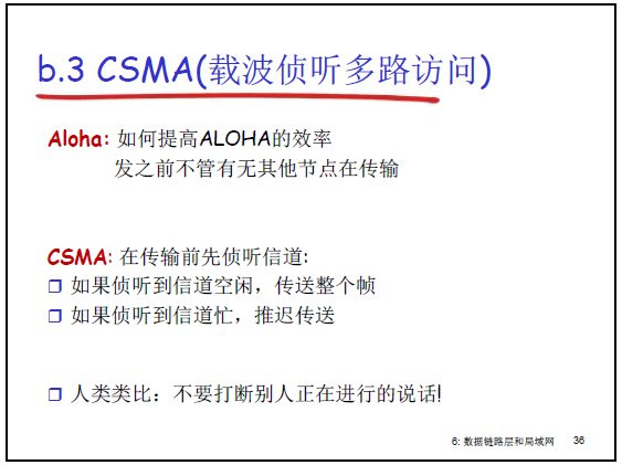• 改进思路:解决 ALOHA 冲突率高的问题 ——发送前先侦听信道(“载波侦听”),避免与正在传输的帧冲突。