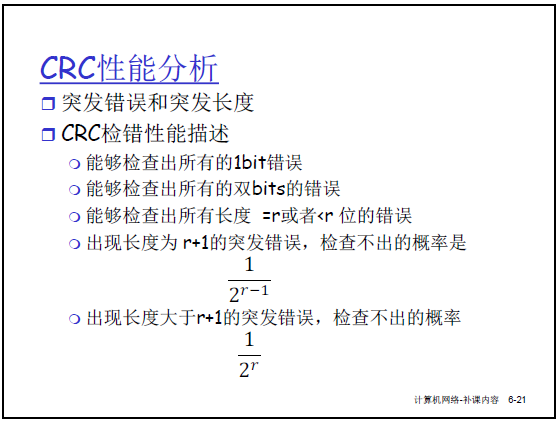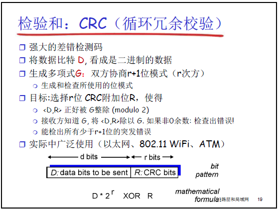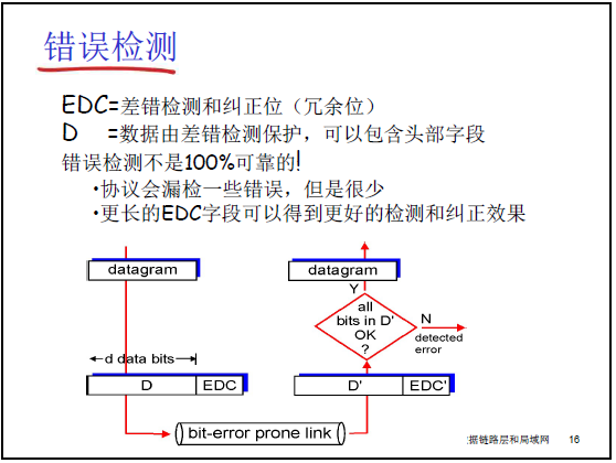 本部分是数据链路层中处理传输错误的核心技术,通过添加冗余位(EDC)实现数据的错误检测与纠正,降低传输干扰的影响。