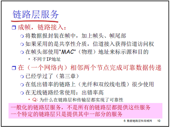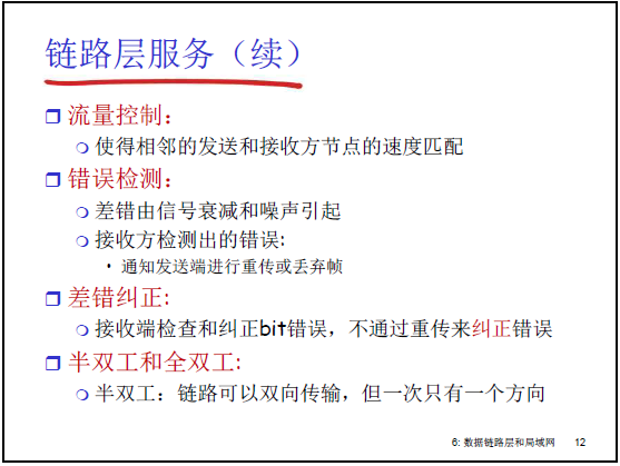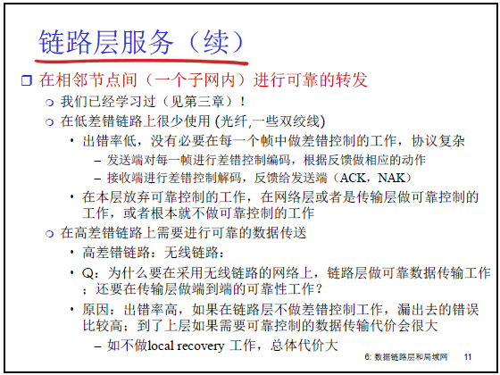 • 可靠数据传输 / 流控:部分链路层需实现(原理与传输层 RDT 一致,本章不重复讲原理)。