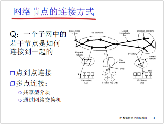 • 多点连接:多节点通过共享介质(如同轴电缆)或网络交换机连接,一个节点发送的帧可被其他节点接收。