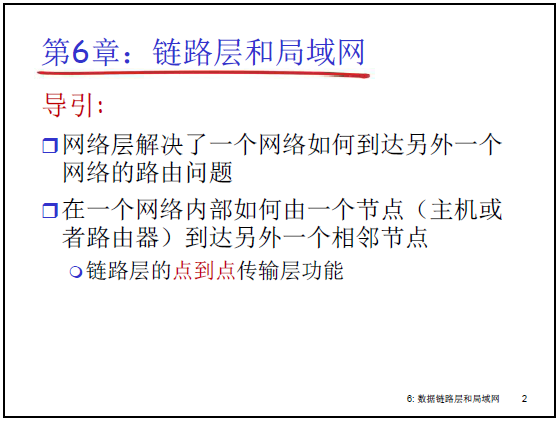 • 链路层的功能:解决子网内相邻节点(主机 / 路由器)的点到点传输问题—— 包括子网内主机间、主机与网关路由器间、路由器与相邻下一跳路由器间的传输。