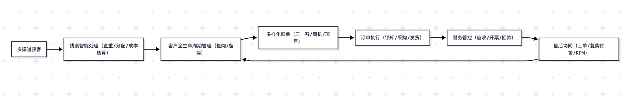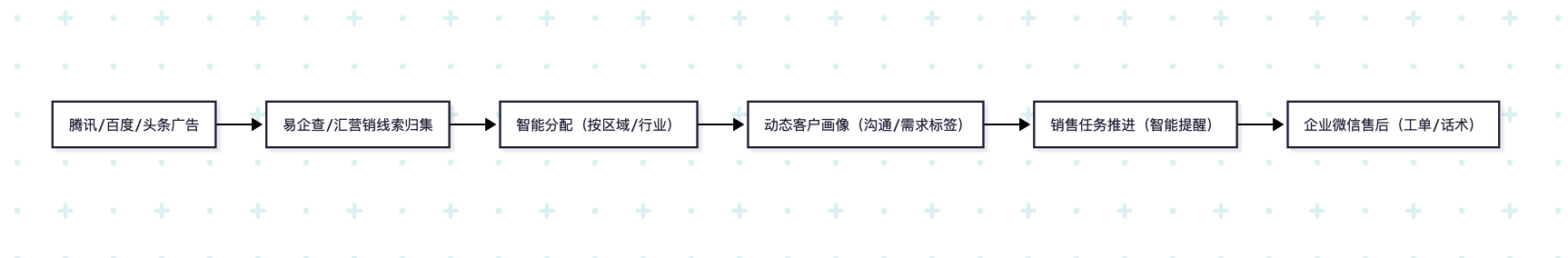 A[多渠道获客] --> B[线索智能处理(查重/分配/成本核算)]