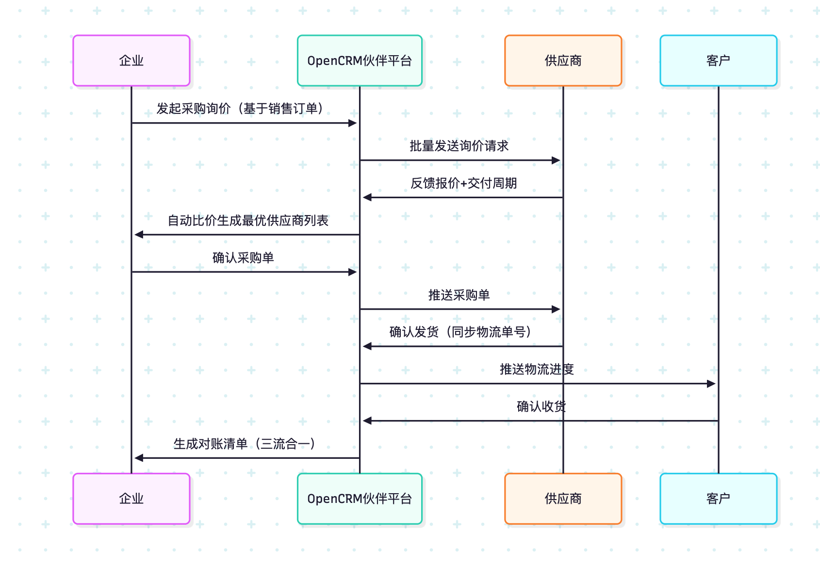 超兔的OpenCRM平台是其供应链协同的核心,实现了企业与上下游的“双向业务联动”,时序图如下: