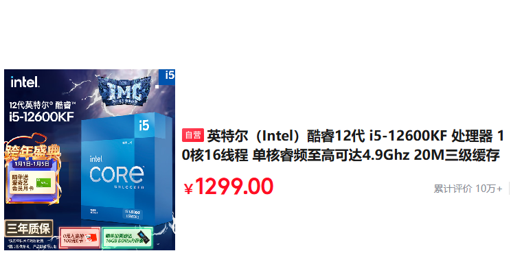 英特尔(Intel)酷睿12代 i5-12600KF 处理器 10核16线程 单核睿频至高可达4.9Ghz 20M三级缓存 盒装CPU