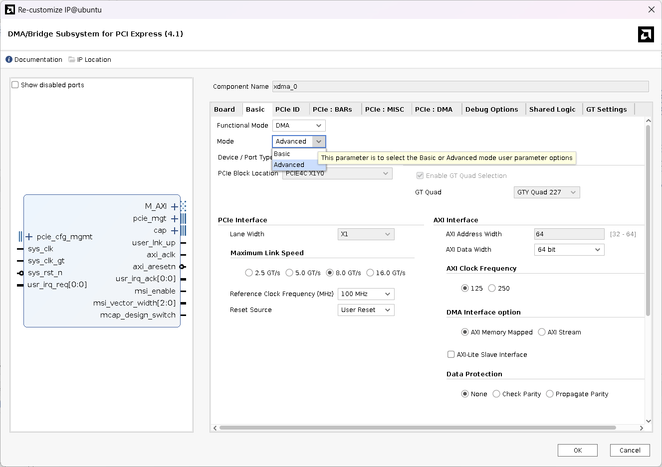 随后,双击 XDMA IP 进入配置界面,将 Mode 设置为 Advanced,并将串联配置设置为 DFX over PCIe,配置过程如下图所示。