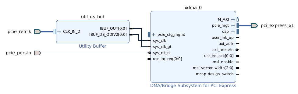 完成 XDMA IP 的参数配置后,运行 run block automation,由 Vivado 自动生成与目标板卡相关的连接关系与约束。生成结果如图所示。