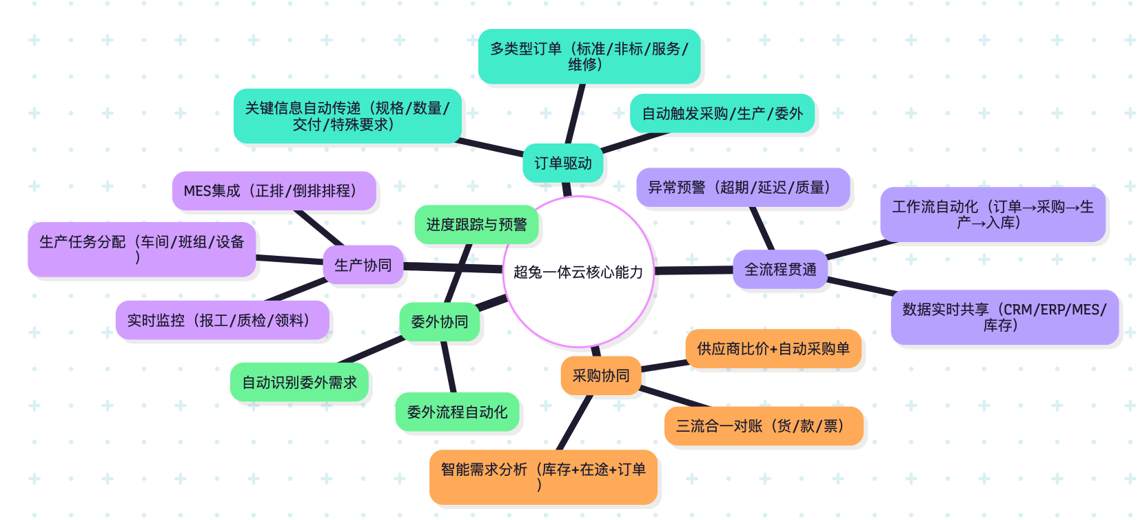 订单生成多样性、关键信息传递准确性、后端(采购/生产/委外)联动自动化 |