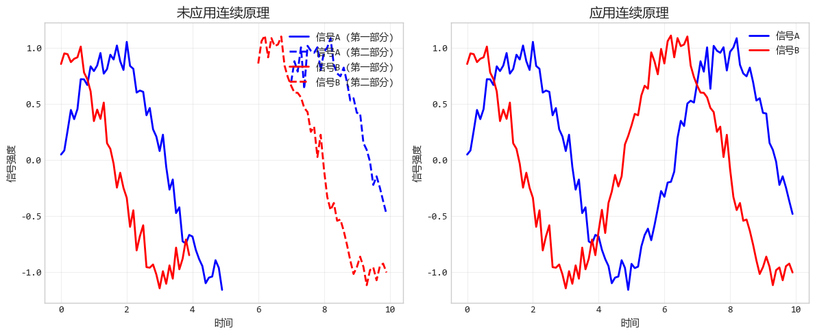 ax1.plot(time[60:], signal2[60:], 'r--', linewidth=2, label='信号B (第二部分)')# 右侧:连续的展示
