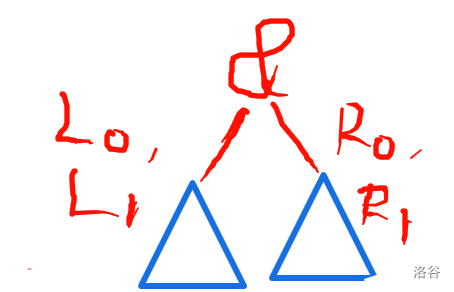 对于这种表达式的题目,我们一般都要建一棵表达式树。这道题我也用到了树形 DP。其实大家应该都接触到过,在题目中叫你求这颗二叉树的大小,在某种意义上也是树形 DP。怎么整呢?我们在每个子树的空格处填入 \(0\) 和 \(1\),得到结果 \(0\) 和 \(1\) 的方案数分别是多少。以下图片中的 \(L_0,L_1,R_0,R_1\) 分别表示左右子树算出来为 \(0\) 和 \(1\) 的方案数。