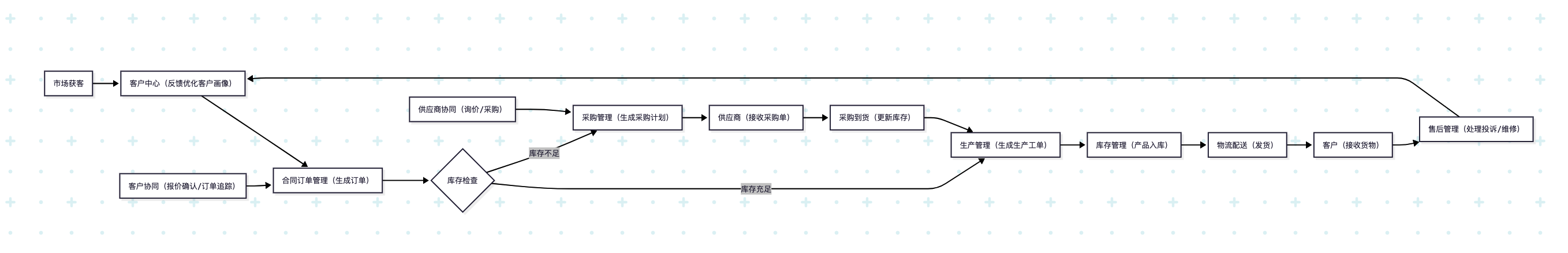 需求驱动:客户订单是供应链的起点——订单生成后,系统自动检查库存,库存不足则触发采购计划,采购单推送给供应商,供应商确认后生成生产工单;