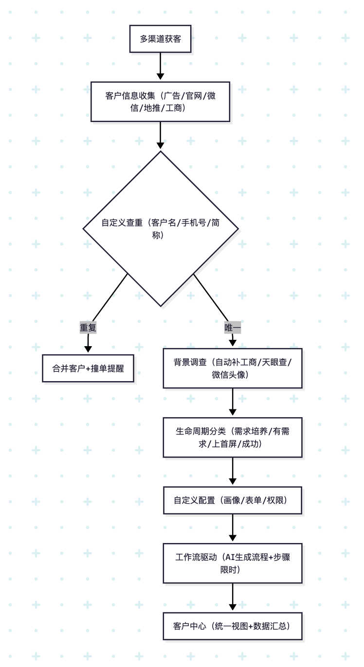 A[多渠道获客] --> B[客户信息收集(广告/官网/微信/地推/工商)]